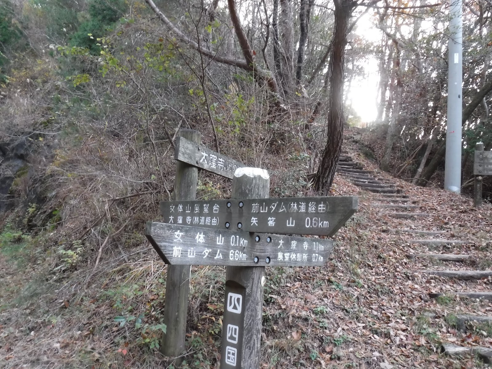 高尾山先の272m三角点から左に「藍染山」、右奥に「大麻山」が尾根繋がりに見える。縦走を楽しむとも聞いた