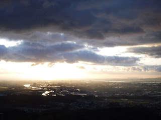 その登山道から河川と徳島平野が朝日に輝く、高低差がないまっ平らな平野である