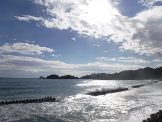 穏やかで、青く、静かな海に、深く切れ込む湾と突き出す半島が海の険しさ、航路の難しさも同時に見せる。優しくて難しい海でもある