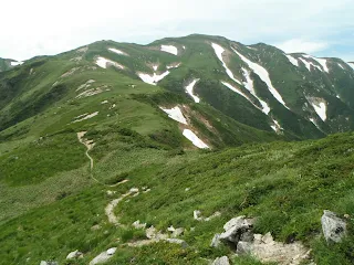 このゆったり嫋やかな稜線は朝日山塊の秀逸、のんびり歩きたくなる場所である。