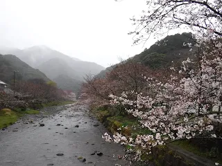 「長九郎山(995.7m)」登山口の川縁、桜がこの雨の中で健気に川に咲き張り出し大風に揺れている