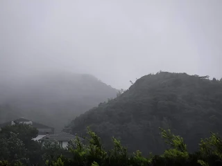 風は北西風、木々の葉は裏返り大きく揺れ横殴りの雨が降る