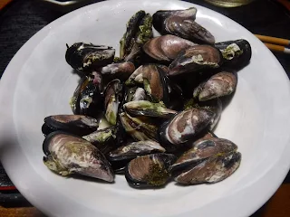 昨日の磯遊び海藻とカサガイだけではなく「クロゲ(我が地の方言)」(イガイ)を20個程採ってきた